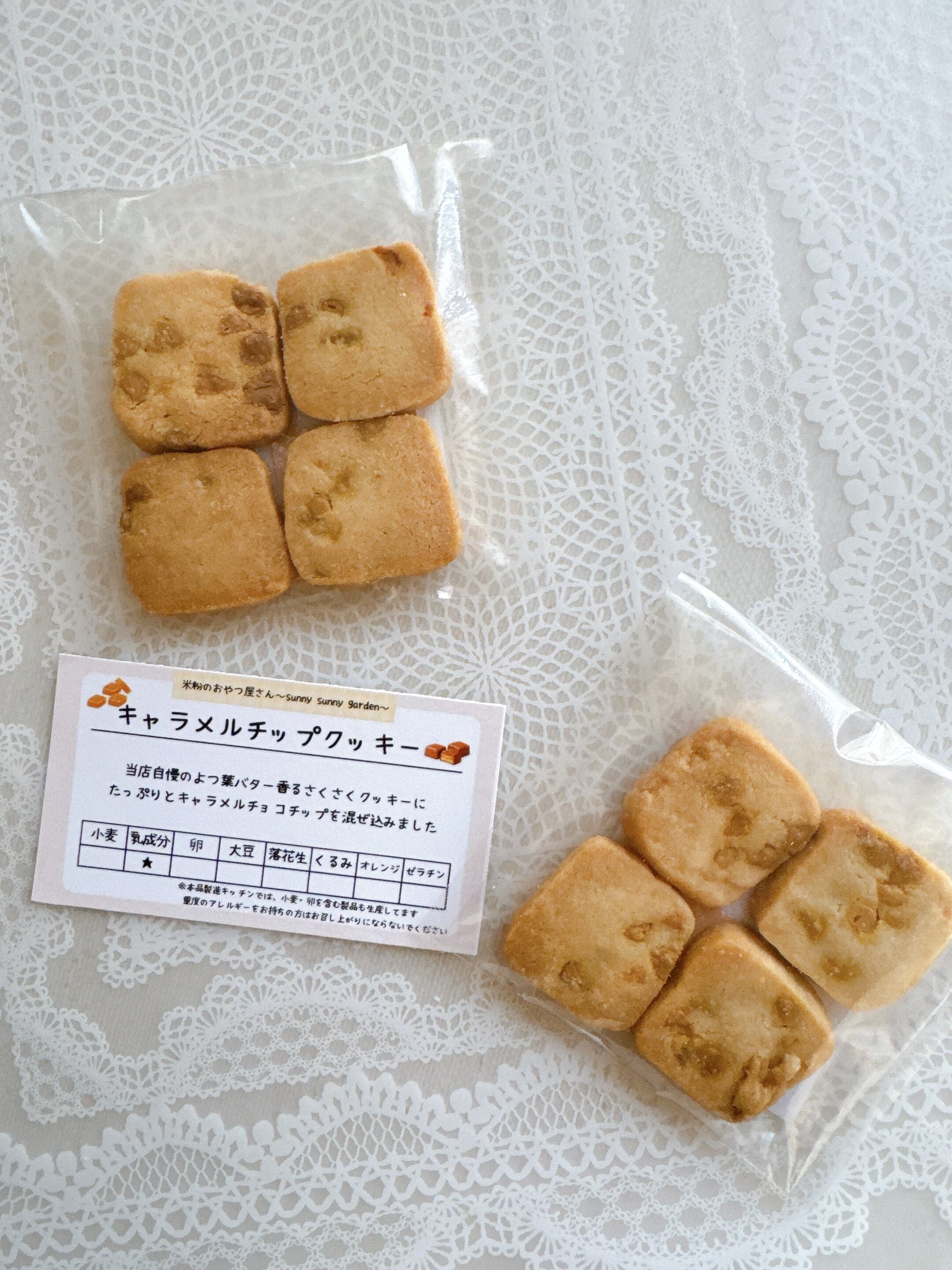当店のクッキーはレンタルキッチンにて製造しております。製造過程で空中飛散や微量混入の可能性があるため、アレルギーをお持ちの方はご注意ください。重度のアレルギー反応が出る方はご購入をお控えいただくようお願い申し上げます。